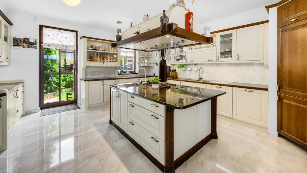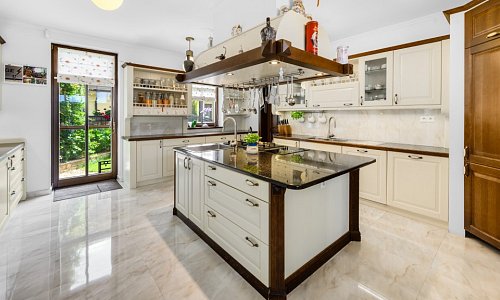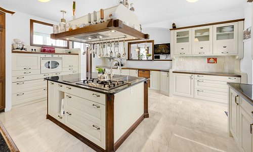 * moderná kuchyňa z masívneho dreva so zabudovanými spotrebičmi (mikrovlnná rúra, elektrická rúra, elektrická platňa, umývačka riadu, chladnička, mraznička, digestor)