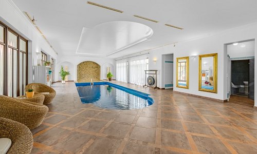 * Ground floor: hall, office with its own wardrobe and bathroom, living room with a fireplace, dining room, pantry, kitchen, master bedroom with its own wardrobe and bathroom, laundry room, technical room for staff, toilet, winter garden with entrance to outside terrace, interior pool with 90 m3 capacity, Finnish sauna and steam sauna.