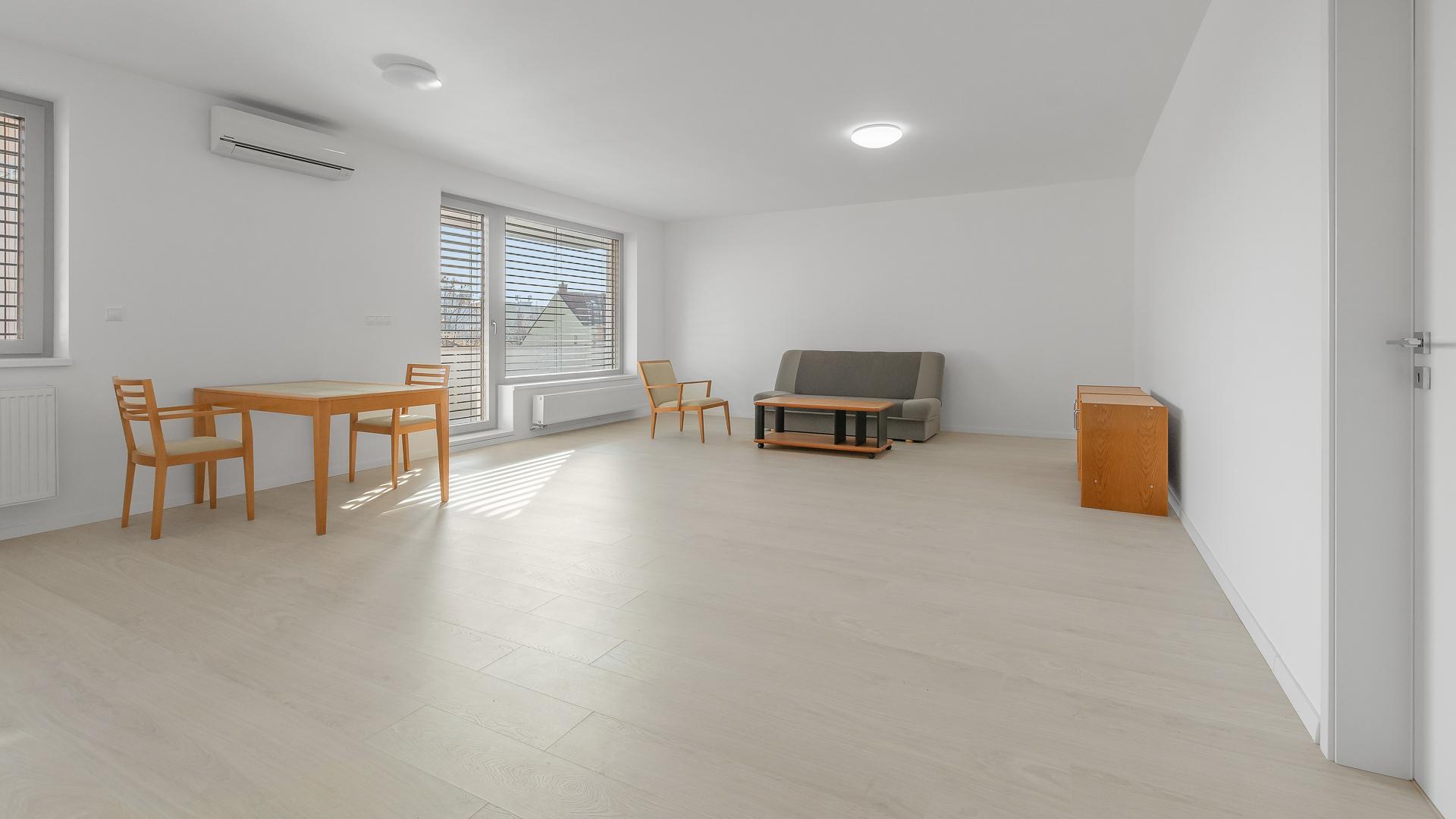 POPIS BYTU: vstupná chodba, obývacia izba prepojená s kuchyňou a východom na priestrannú loggiu o rozlohe 11,93 m2, spálňa so samostatnou kúpeľnou so sprchovým kútom a WC, samostatná izba z východom na loggiu o rozlohe 11 m2, samostatná izba, kúpeľňa s vaňou a WC, samostatné WC a pivnica.